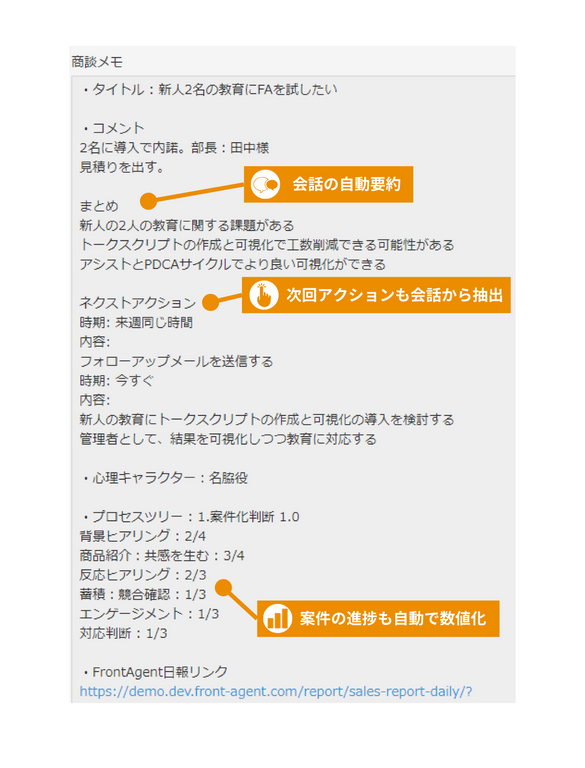 SFAツールと連携することで、Front Agentの音声付議事録を、