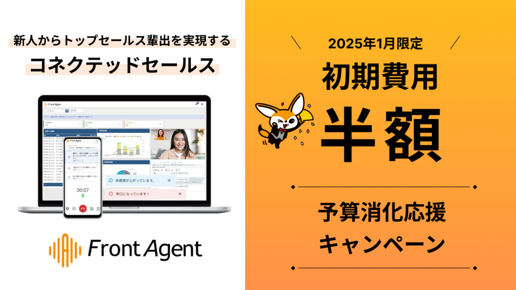 新人からトップセールスを輩出するコネクテッドセールス・プラットフォーム*「Front Agent」を開発・提供するUmee Technologies株式会社(本社:東京都調布市、代表取締役:新納 弘崇、以下「ユミー」)は、本日1月10日(金)より1月31日(金)まで、【初期費用半額】予算消化応援キャンペーンを開始いたします。