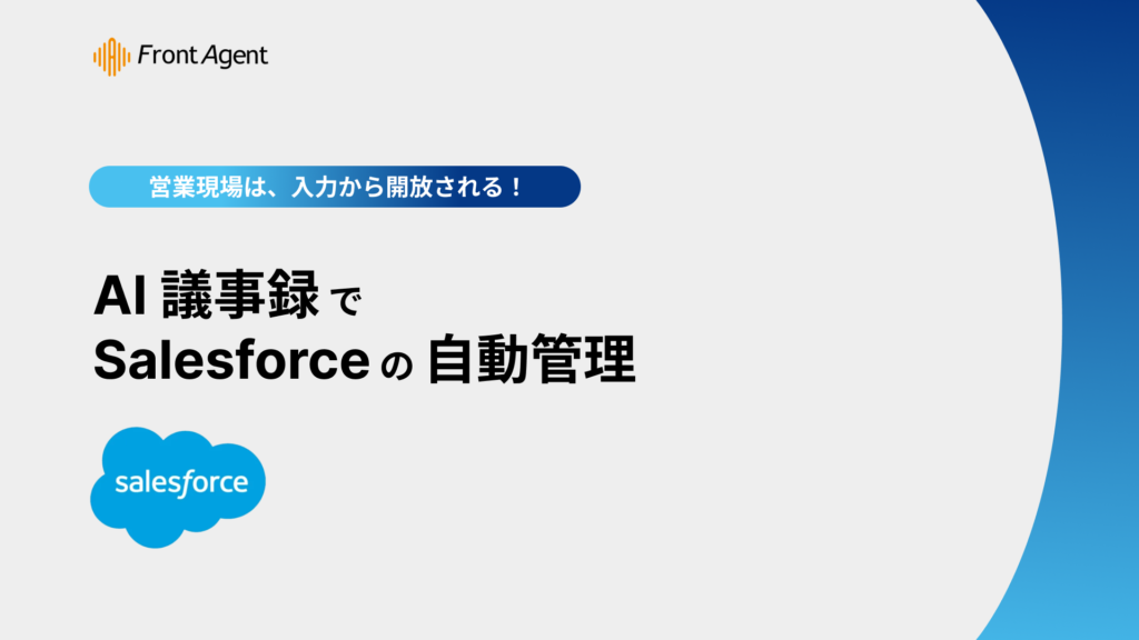 お役立ち資料 【100名限定】営業現場は、入力から開放される!AI議事録でSalesforceの自動管理 Salesforceを活用した営業支援・顧客管理で「共通するよくある課題」に対して、AIを活用することで何ができるのか?を、AI開発と提供を業務とする弊社が、営業代行業のお客様への伴走支援を通して得たベストプラクティスをハンドブックにまとめました。 当資料では、営業現場におけるSalesforce活用で直面する下記課題にアプローチします。【この資料で解決する課題】営業の現場を管理するためにSalesforceを導入したが、現場負担が大きく、実際には上手く運用できていない顧客管理に明確な運用基準がなく、案件整理に手間と時間がかかっている担当者によって商談記録内容にバラつきがあり、上司は正確な分析ができない【こんな方におススメ】Salesforceを活用した商談記録や顧客管理に苦労している方営業現場の事務負担を減らし、1件でも多く営業したい方商談記録を活用して正確な分析をし、戦略を立てたい方AIを活用したSalesforce運用の最前線を知りたい方 必須 会社名 必須 氏名 必須 ふりがな 必須 電話番号 必須 メールアドレス 必須 職種 営業マーケティングカスタマーサポート人事経営企画会社役員 必須 役職 経営者・役員クラス事業部長・部長クラス課長クラス係長・主任クラス一般社員・職員その他 必須 従業員数 1名以上 - 15名以下16名以上 - 30名以下31名以上 - 50名以下51名以上 - 100名以下101名以上 - 500名以下501名以上 - 1000名以下1001名以上 必須 現在の営業やカスタマーサポートに関する関心・注力度合いを教えてください。 強い課題を感じる今後注力していきたい情報収集をしている段階特に課題・関心はない 必須 現在の顧客管理の方法 キントーンsalesforceHubspotZoho CRMエクセルその他 必須 利用しているカレンダー OutlookGoogleガルーンその他 必須 利用しているビジネスSNS SlackTeamsチャットワークラインワークスその他 必須 同意の確認 プライバシーポリシーに同意する Δ