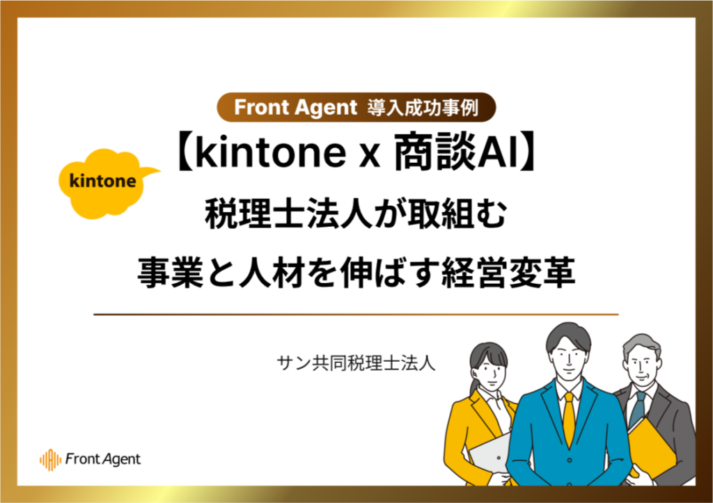 お役立ち資料 【kintone x 商談AI】税理士法人が取組む事業と人材を伸ばす経営変革 多くの業務でコミュニケーションを必要とする税理士業務。 事務所の順調な成長を実現するには、日々のクライアント獲得や社員の育成を効率的に行わなければなりません。レガシーな業態である中、「働き方改革大賞」を取得した税理士法人でも解決が難しい、人材を最大限活かした事業拡大を実現する理想の体制とは? 【この資料で分かること】 現場に負荷をかけず、生産性を向上する施策 現場任せの属人的な営業からの変革 人材不足の日本での成長戦略 【こんな方におススメ】 社長や上司の顧客対応ノウハウを組織展開したい方 ミスマッチを防ぐ人材採用をしたい方 透明性ある人材評価を仕組み化・内製したい方 kintoneやsalesforceなどのCRMを効率良く運用した方 必須 会社名 必須 氏名 必須 ふりがな 必須 電話番号 必須 メールアドレス 必須 職種 営業マーケティングカスタマーサクセスカスタマーサポート人事経営企画会社役員 必須 役職 経営者・役員クラス事業部長・部長クラス課長クラス係長・主任クラス人事一般社員・職員その他 必須 従業員数 1名以上 - 15名以下16名以上 - 30名以下31名以上 - 50名以下51名以上 - 100名以下101名以上 - 500名以下501名以上 - 1000名以下1001名以上 必須 現在の事業成長・人材育成に関する関心・注力度合いを教えてください。 強い課題を感じる今後注力していきたい情報収集をしている段階特に課題・関心はない 必須 現在の顧客管理の方法 キントーンsalesforceHubspotZoho CRMエクセルその他 必須 利用しているカレンダー OutlookGoogleガルーンその他 必須 利用しているビジネスSNS SlackTeamsチャットワークラインワークスその他 必須 同意の確認 プライバシーポリシーに同意する Δ